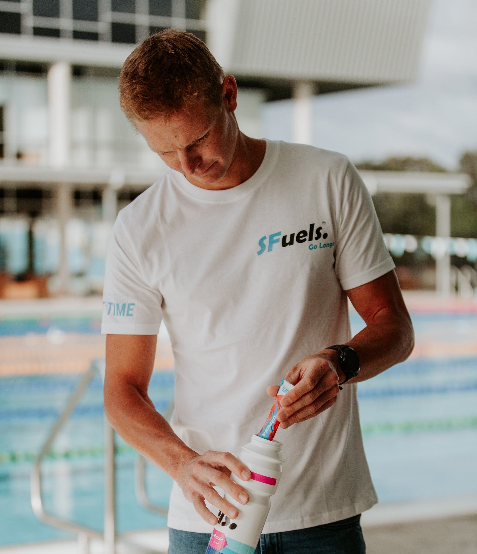 The original SFuels branded Classic T-Shirt. Highlighting the 'Spike-FREE' SF in blue, captures the foundations of the company, while also highlighting on the sleeve the industry-leading RIGHT FUEL RIGHT TIME nutrition approach to endurance fueling.